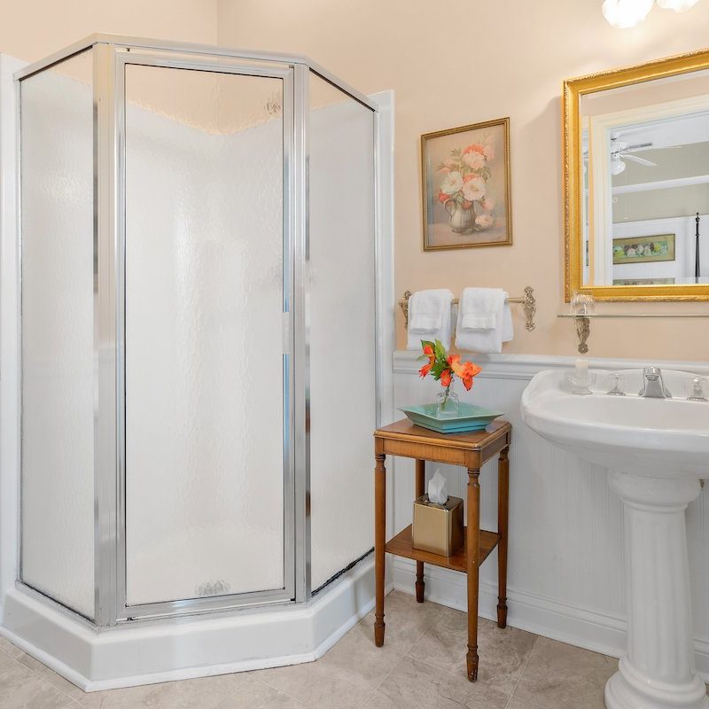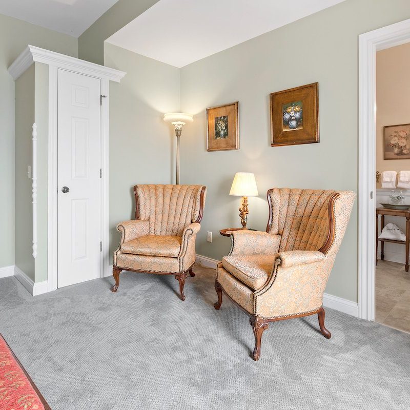 Spend the day biking, and take a stroll downtown to shop. After a romantic dinner, come back to your room decorated in shades of greens and peach. Coupled with floral oil paintings, this room will set a relaxing mood. Enjoy the rocking chairs on your private porch while watching the sailboats, chatting or stargazing. Then snuggle in the queen bed, layered with fresh linens and warmed by a glowing fire.
